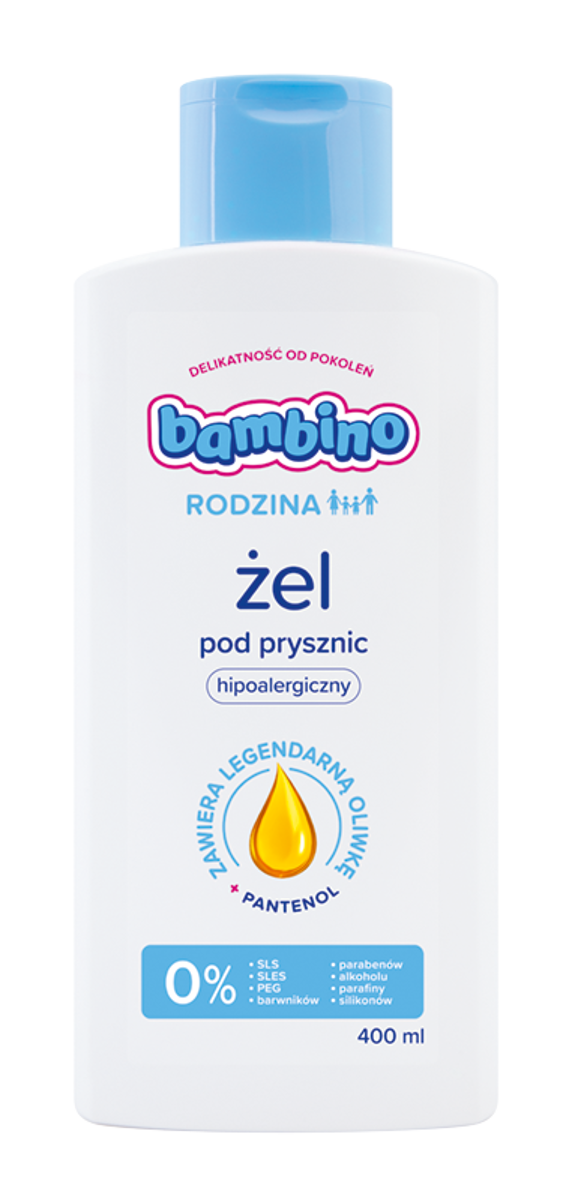Bambino Rodzina żel pod prysznic 400 ml to produkt myjący w ramach zupełnie nowej linii Bambino Rodzina. Ten kosmetyk przeznaczony do użytku zarówno dla rodziców jak i dzieci powyżej 3 roku życia to produkt hipoalergiczny i wyprodukowany w Polsce