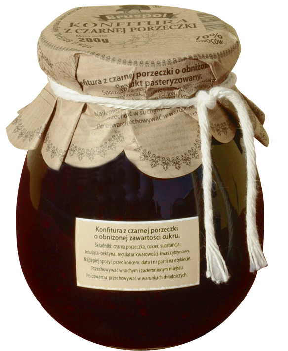 Konfitura z czarnej porzeczki o obniżonej zawartości cukru to produkt pasteryzowany. Sporządzono z 70 g owoców na 100 g produktu.