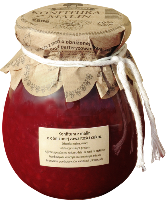 Konfitura z malin o obniżonej zawartości cukru to produkt pasteryzowany. Sporządzono z 70 g owoców na 100 g produktu.