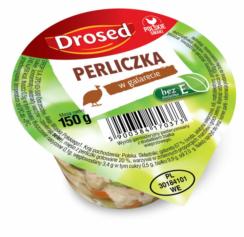 Perliczka w Galarecie to poręczny produkt w kubku. Doprawiony selektywnie wybranymi przyprawami. Najwyższa jakość mięsa gwarantuje niepowtarzalny aromat i smak, który idealnie komponuje się z galaretką. Polecany nie tylko miłośnikom galaretek. Dodatkowo galaretka drobiowa poprawia wygląd skóry. Ma też zbawienny wpływ na kości i stawy.