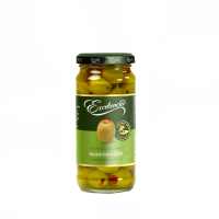 Oliwki zielone manzanilla z pastą paprykową w zalewie z dodatkiem soli morskiej. Oliwki te zostały zebrane ręcznie w Hiszpanii.
