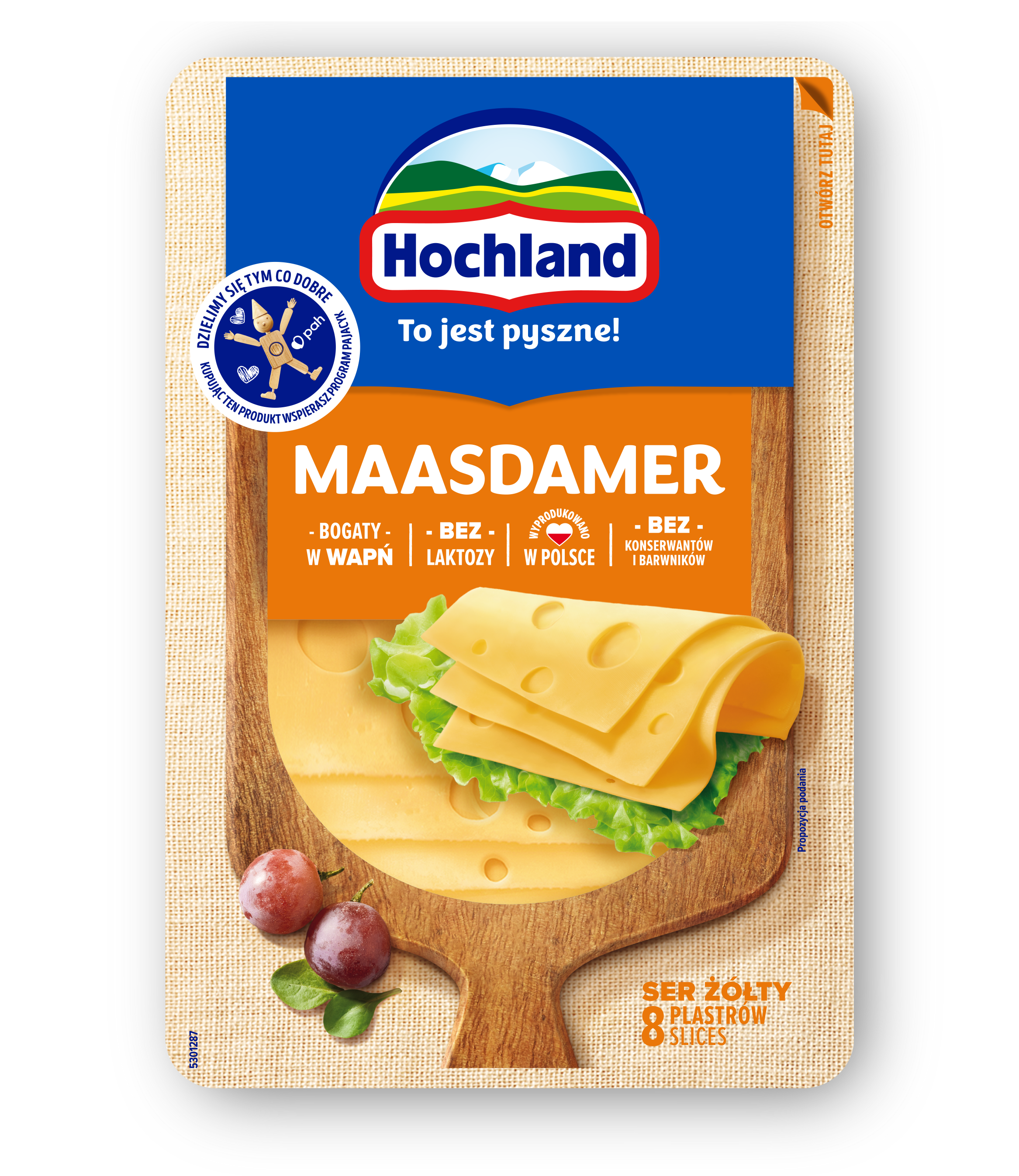 Hochland Maasdamer ser żółty w plastrach. Ser podpuszczkowy dojrzewający.