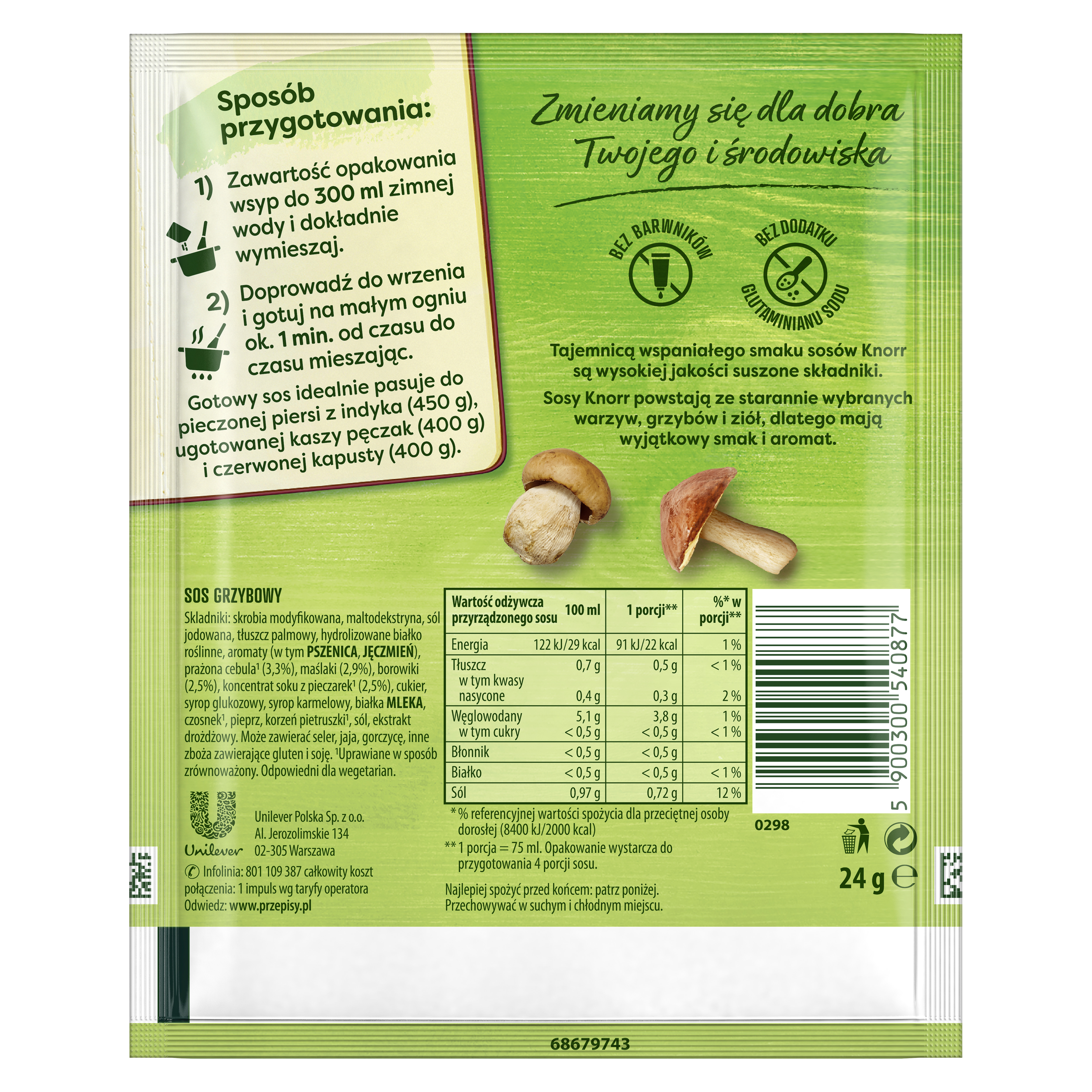 | Składniki | skrobia modyfikowana, maltodekstryna, sól jodowana, tłuszcz palmowy, hydrolizowane białko roślinne, aromaty (w tym PSZENICA, JĘCZMIEŃ), prażona cebula (3,3%), maślaki (2,9%), borowiki (2,5%), koncentrat soku z pieczarek (2,5%), cukier, syrop glukozowy, syrop karmelowy, białka MLEKA, czosnek, pieprz, korzeń pietruszki, sól, ekstrakt drożdżowy. Może zawierać seler, jaja, gorczycę, inne zboża zawierające gluten i soję. Wprawiane w sposób zrównoważony. Odpowiedni dla wegetarian. |