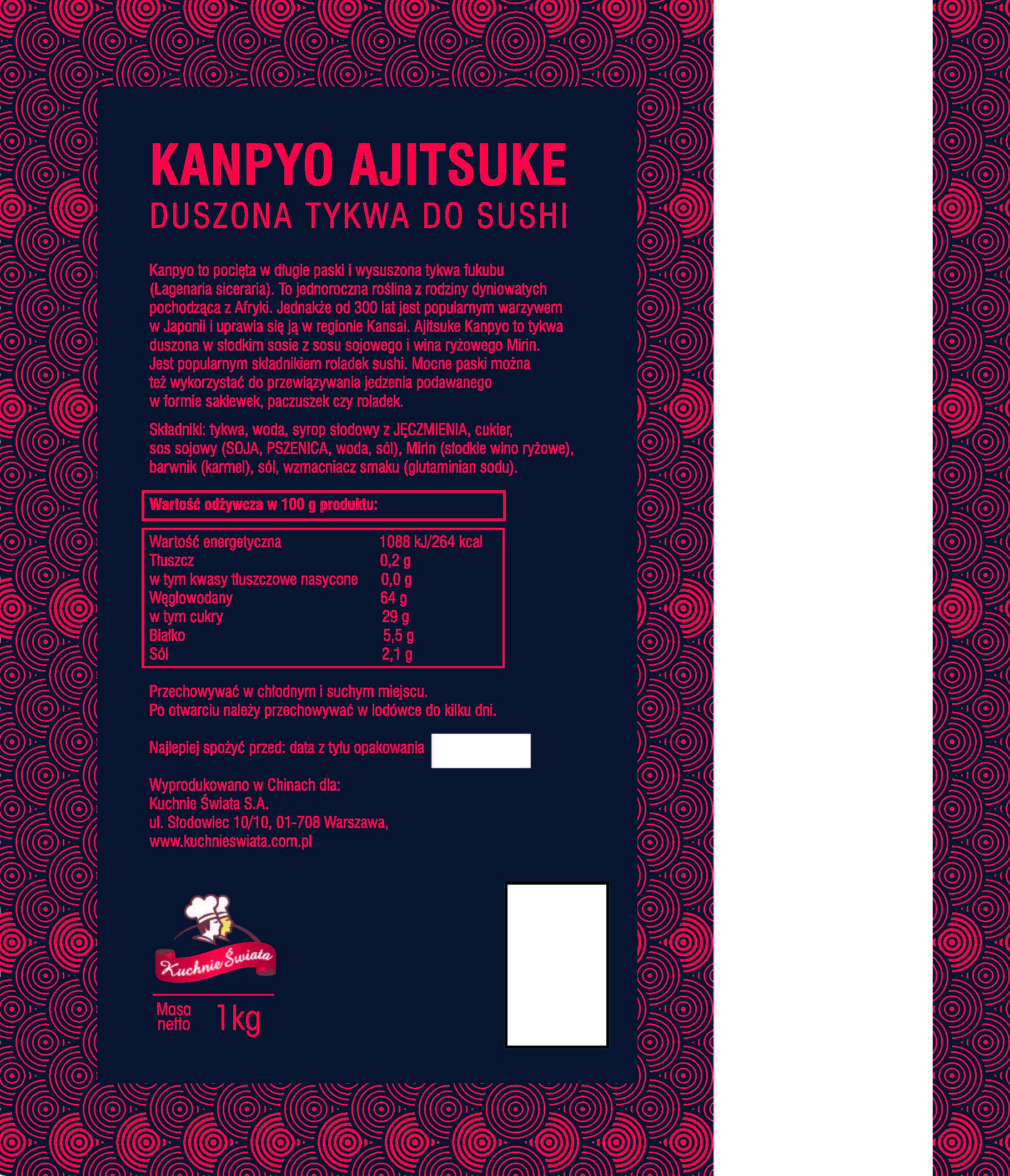 Kanpyo (tykwa), woda, syrop słodowy z jęczmienia, cukier, sos sojowy (soja, pszenica, woda, sól), mirin (słodkie wino ryżowe), barwnik (karmel), sól, wzmacniacz smaku (glutaminian sodu)Przechowywanie