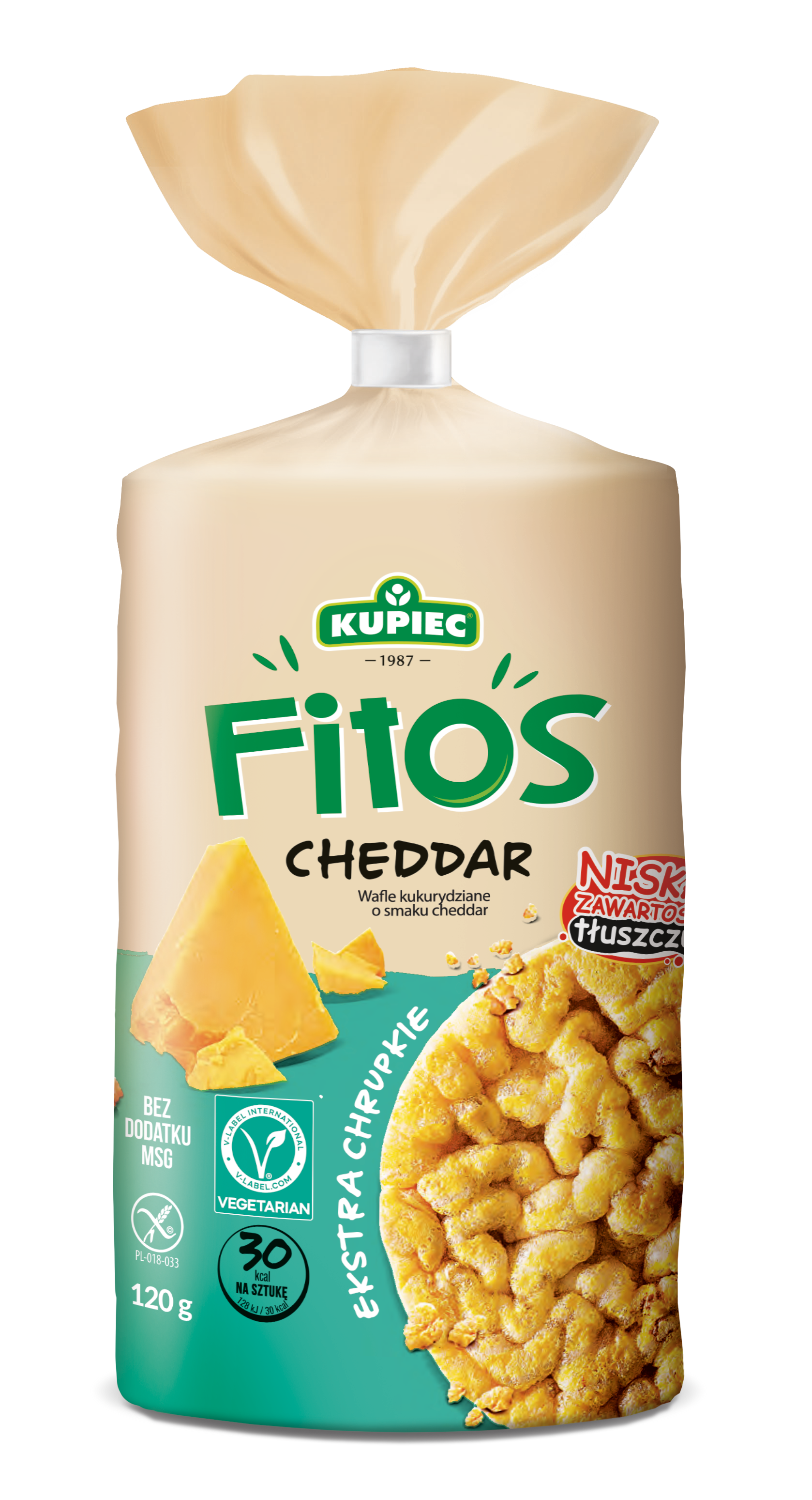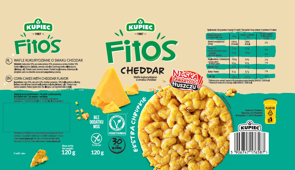 Marka FITOS to nowość w portfolio firmy Kupiec – Ekstra chrupkie wafle smakowe w wygodnym opakowaniu z klipsem. Wafle kukurydziano w wersji wytrawnej – Cheddar. Innowacyjna technologia produkcji wafli FITOS sprawia, że po ich spożyciu na palcach nie zostaje tłusta posypka. Dzięki temu, nasze dłonie są czyste a my możemy swobodnie grać na konsoli, komputerze, czy oglądać TV bez brudzenia przedmiotów wokół nas. FITOS to wyrazistość smaku przy użyciu minimalnej ilości tłuszczu, doskonała alternatywa dla konwencjonalnych i kalorycznych chipsów i chrupek. Doskonała propozycja dla osób na diecie bezglutenowej (Certyfikat Przekreślonego Kłosa) oraz wegańskiej (Certyfikat V-label Vegetarian)