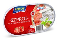 | Składniki | szprot (55% ryby przed sterylizacją), sos pomidorowy (45% przed sterylizacją): woda, koncentrat pomidorowy (17%), cukier, musztarda(woda, ocet spirytusowy, gorczyca biała, cukier, sól, przyprawy), skrobia kukurydziana modyfikowana, olej rzepakowy, sól, mąka pszenna, substancja zagęszczjąca: guma guar; regulatory kwasowości: kwas octowy i kwas cytrynowy, mieszanka przypraw, aromat paprykii. |