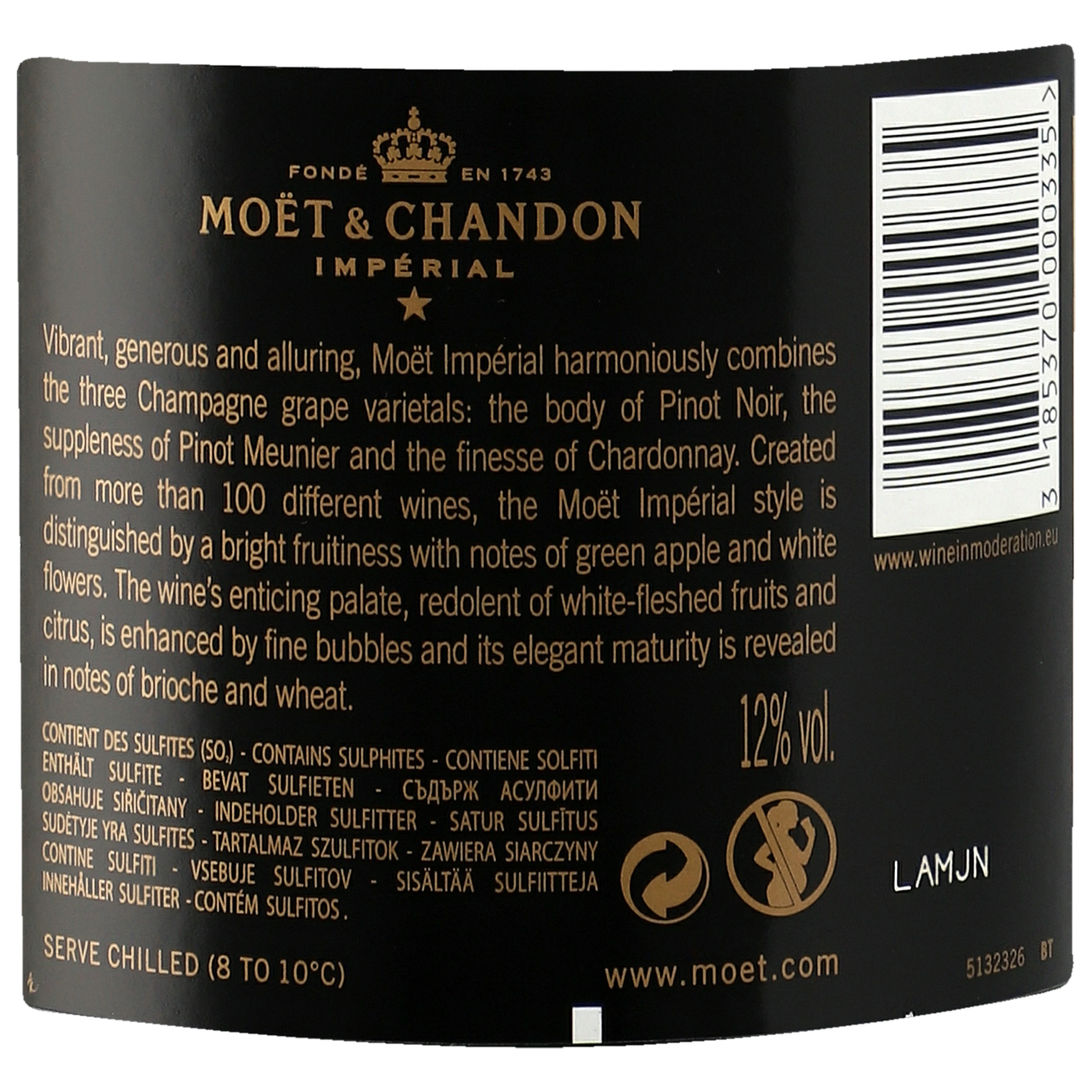 Moët & Chandon jest niekwestionowanym liderem kategorii na świecie. Marka ta to synonim elegancji, luksusu, splendoru i przyjemności. Moët & Chandon to najbardziej pożądany szampan świata, uwielbiany przez gwiazdy światowego kina, celebrytów. Jest wytrawną kompozycją win z winogron Chardonnay, Pinot Noir i Pinot Meunier. Kompozycja zawiera 30% starannie dobranego wina z rezerwy.