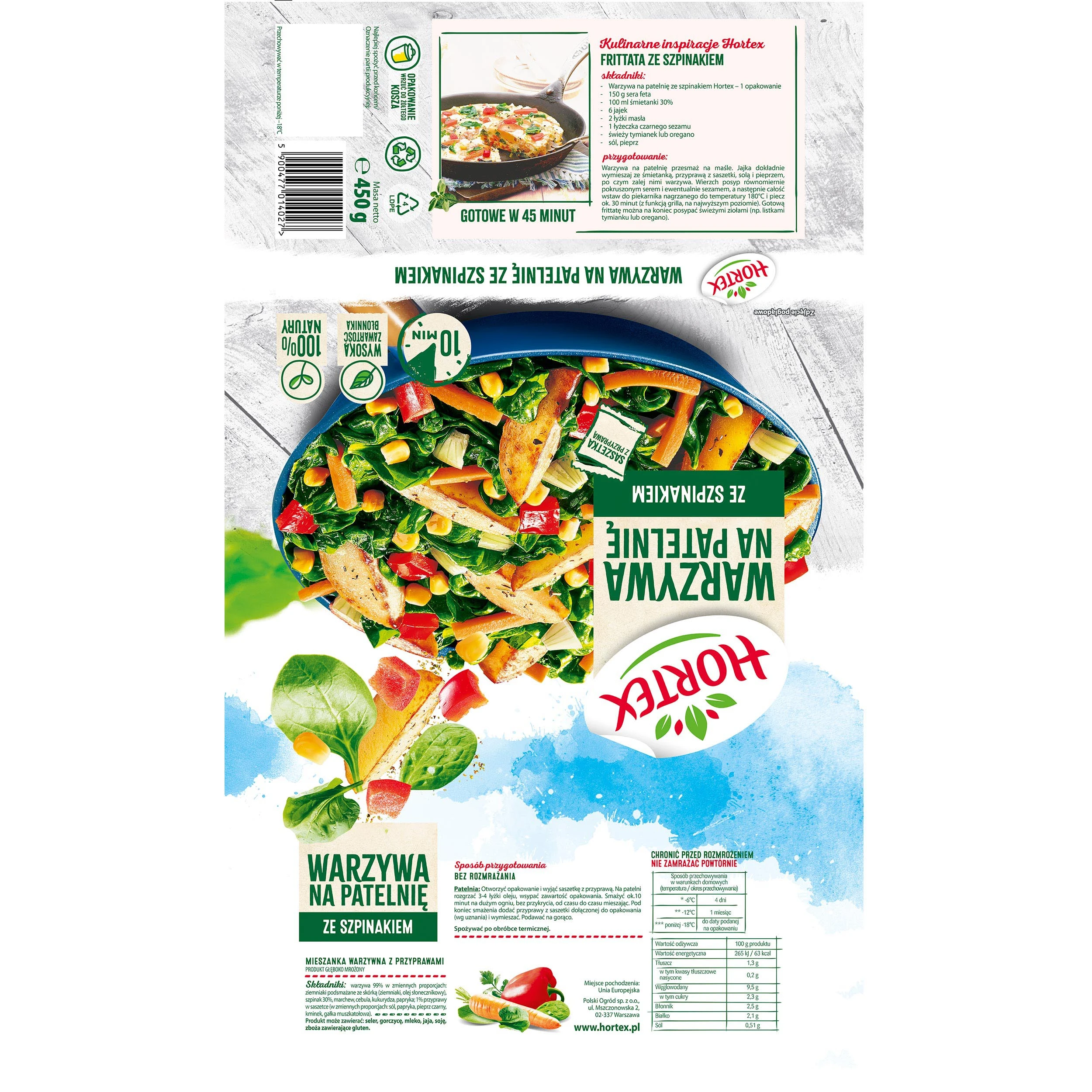 Warzywa na patelnię Hortex to zarówno pyszne warzywne danie samo w sobie, jak również doskonałe źródło wielu smakowitych inspiracji kulinarnych - możesz użyć ich do makaronów, zapiekanek… Na co tylko przyjdzie Ci ochota. W ich skład wchodzą: liście szpinaku, ziemniaki podsmażane, kukurydza, marchewka, czerwona papryka i cebula. Całość smaku dopełnia starannie dobrana mieszanka przypraw z kminkiem.