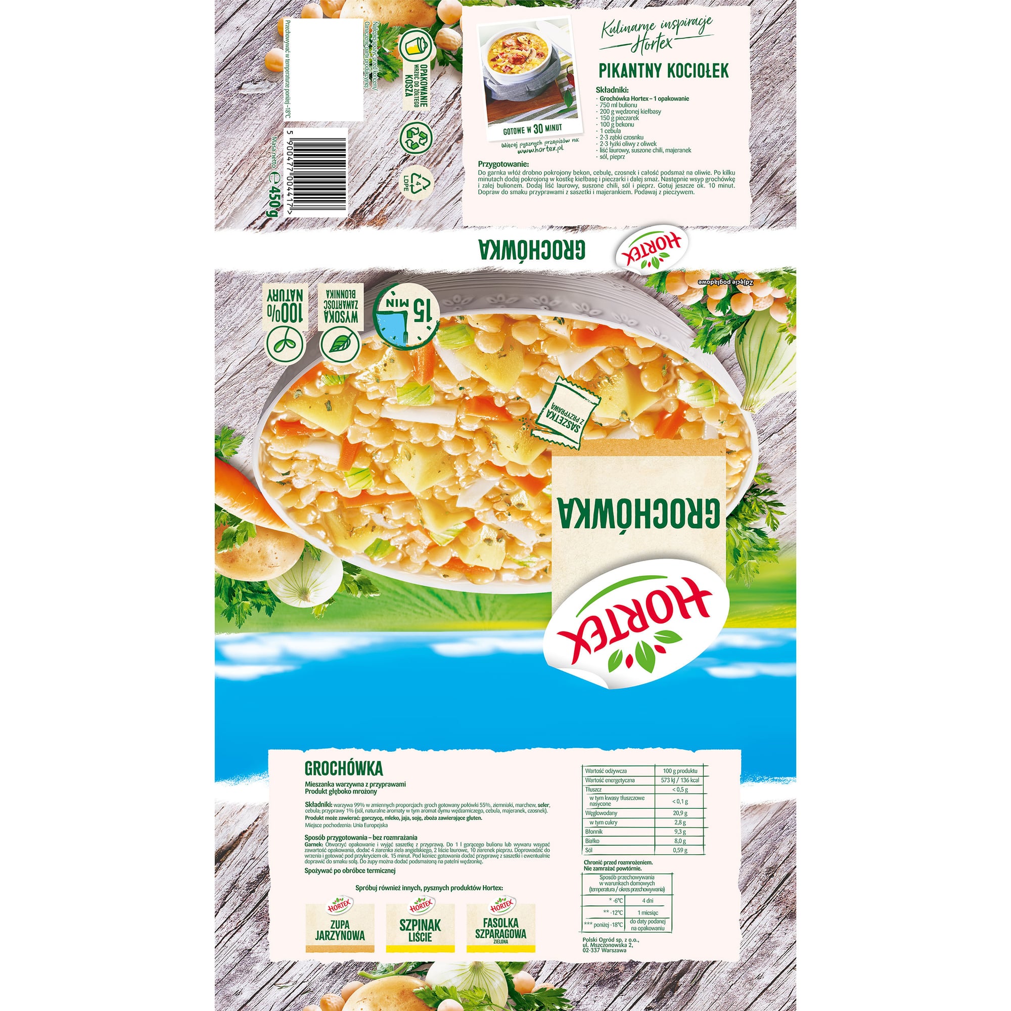 | Składniki | warzywa 99% w zmiennych proporcjach: groch gotowany połówki 55% ziemniaki marchew seler cebula przyprawy 1% (sól, aromaty w tym aromat dymu wędzarniczego, cebula, majeranek, czosnek) |