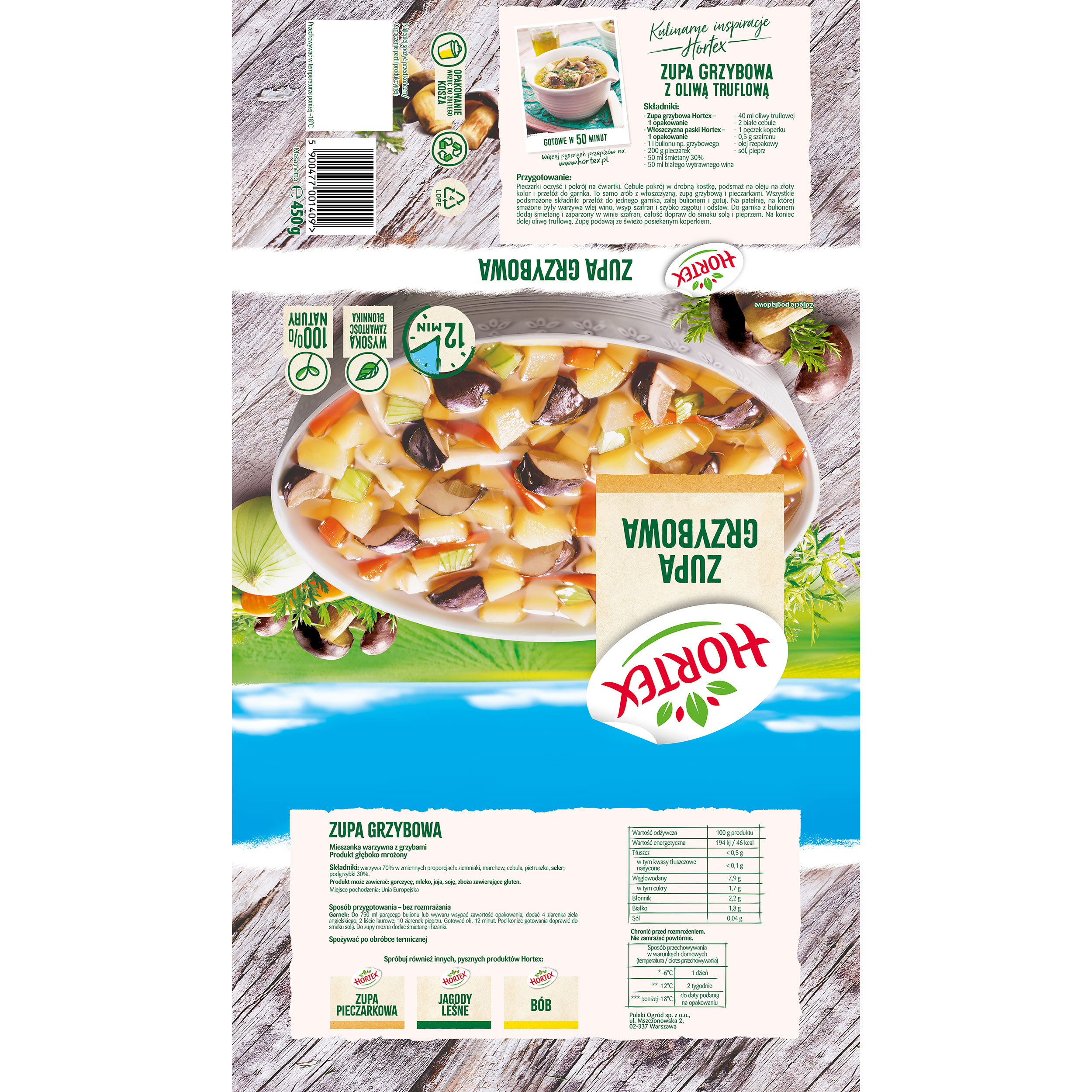 | Składniki | Warzywa 70% w zmiennych proporcjach: ziemniaki, marchew, cebula, pietruszka, seler; podgrzybki 30%. |
