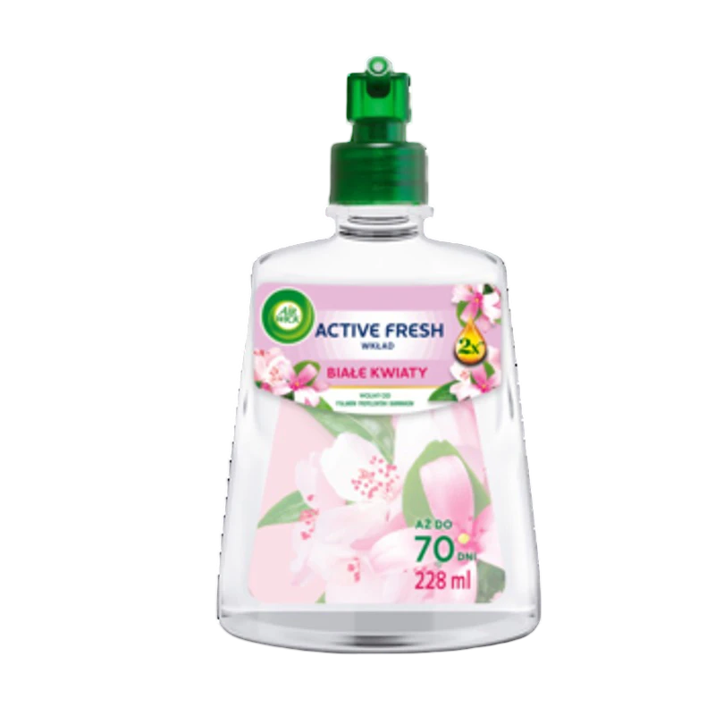 Air Wick Active Fresh Białe Kwiaty wkład 228 ml z podwojoną zawartością olejków eterycznych*; Delikatne kwiaty i białe płatki tworzą harmonijną, pudrową kompozycję. Ciepłe nuty bursztynu, drewna, przypraw i owoców dodają jej głębi i wyrafinowania.; CECHY PRODUKTU: -Odświeża powietrze i neutralizuje nieprzyjemne zapachy 24/7; -Formuła na bazie wody; -Z naturalnymi olejkami eterycznymi; -95% składników pochodzenia naturalnego; -Bez propelentów, ftalanów i barwników; -Regulacja intensywności zapachu z urządzenia; -Przycisk Instant Boost - zapach na życzenie; -Działanie do 70 dni**; -Opakowanie nadające się do recyklingu; *Zapach wzbogacony 2 razy większą ilością olejków eterycznych w porównaniu do poprzedniej formuły Air Wick.; NUTY ZAPACHOWE: -Nuty głowy: Zielone, Czerwone Owoce; Nuty serca: Jaśmin, Plumeria, Neroli, Gardenia; Nuty bazy: Drewno, Bursztyn, Cynamon; 95% SKŁADNIKÓW POCHODZENIA NATURALNEGO I OLEJKI ETERYCZNE - Air Wick 24/7 ACTIVE FRESH to wyjątkowa formuła stworzona ze starannie wyselekcjonowanych składników, którą wzbogaciliśmy o naturalne olejki eteryczne. Zawiera aż 95% składników pochodzenia naturalnego i jest pozbawiona ftalanów, propelentów i barwników. Zaproś do swojego domu zapach niesamowitej świeżości i bądź w kontakcie z naturą!; AŻ DO 70 DNI ŚWIEŻOŚCI**; Air Wick 24/7 ACTIVE FRESH wypełni Twój dom zapachem aż do 70 dni**.; WYJĄTKOWA FORMUŁA 24/7 ACTIVE FRESH - Poznaj nasz pierwszy automatyczny odświeżacz powietrza z formułą na bazie wody, który dzięki użyciu unikalnym cząsteczkom, skutecznie neutralizuje brzydkie zapachy przez cały dzień. Air Wick 24/7 ACTIVE FRESH wypełni Twój dom zapachem aż do 70 dni**.; NOWOCZESNE URZĄDZENIE Z FUNKCJĄ INSTANT BOOST & REGULACJĄ INTENSYWNOŚCI ZAPACHU - Wkład Air Wick 24/7 ACTIVE FRESH pasuje do urządzenia przeznaczonego do 24/7 ACTIVE FRESH, które możesz zakupić jako komplet. Automatyczny odświeżacz powietrza na baterie Air Wick 24/7 ACTIVE FRESH posiada przycisk Instant Boost, co oznacza, że możesz użyć go w dowolnym momencie. 24/7 ACTIVE FRESH to Twój ulubiony zapach na życzenie! Urządzenie pozwala na regulację intensywności zapachu i zasilane jest bateriami. Opakowanie po zużyciu nadaje się do recyklingu.; UNIWERSALNY WYGLĄD - Stylowe, niewielkie urządzenie subtelnie ozdobi każde wnętrze i uwolni zapach już po 15 sekundach od uruchomienia. Idealnie sprawdzi się jako odświeżacz powietrza do pokoju, sypialni czy łazienki. **W oparciu o najniższy poziom intensywności zapachu dla urządzenia Air Wick; SPOSÓB UŻYCIA: