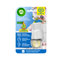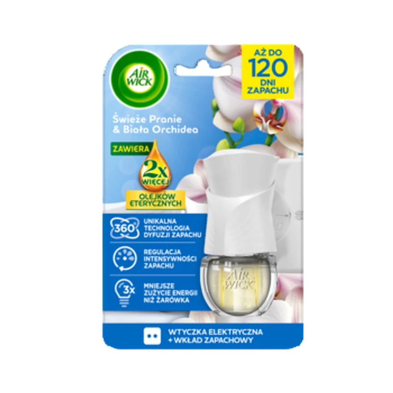 Air Wick elektryczny odświeżacz powietrza o zapachu Świeże Pranie & Biała Orchidea komplet 19ml. Wyobraź sobie czysty zapach świeżo wypranej pościeli z nutami białej orchidei i kwiatu pomarańczy z dodatkiem cytrusów, które wniosą do twojego domu zachwycającą świeżość.; ZALETY PRODUKTU: -2x więcej olejków eterycznych*; -neutralizuje nieprzyjemne zapachy; -aż do 120 dni zapachu**; -5 poziomów intensywności zapachu do wyboru; -unikalna technologia dyfuzji zapachu 360; -w skład zestawu wchodzą: wtyczka oraz wkład zapachowy; -wygodny i prosty w obsłudze; -idealny do pokoju dziennego, salonu, łazienki oraz kuchni; Aż do 120 dni zapachu**. 5 poziomów intensywności pozwala Ci dowolnie dopasować intensywność zapachu w pomieszczeniu tak, jak lubisz. Elektryczny odświeżacz powietrza Air Wick skutecznie eliminuje nieprzyjemne zapachy i jest wyjątkowo trwały. *Zapach wzbogacony 2 razy większą ilością olejków eterycznych w porównaniu do poprzedniej formuły Air Wick. **Przy najniższym poziomie zużycia przez 12 godzin dziennie.; NUTY ZAPACHOWE: Nuty głowy: Jabłko; Nuty serca: Owoce, Róża, Konwalia; Nuty bazy: Pudrowe, Piżmo; SPOSÓB UŻYCIA: Używaj wyłącznie z wkładami Air Wick lub Botanica. 1. Zdejmij plastikową nakrętkę z wkładu.; 2. Umieść wkład w dolnej części wtyczki, aż usłyszysz kliknięcie. Upewnij się, że wkład cały czas znajduje się w pozycji pionowej.; 3. Umieść wtyczkę w gniazdku.; 4. Aby zwiększyć lub zmniejszyć intensywność zapachu, przekręć tarczę na górze wtyczki. Największy znak = największa intensywność.;