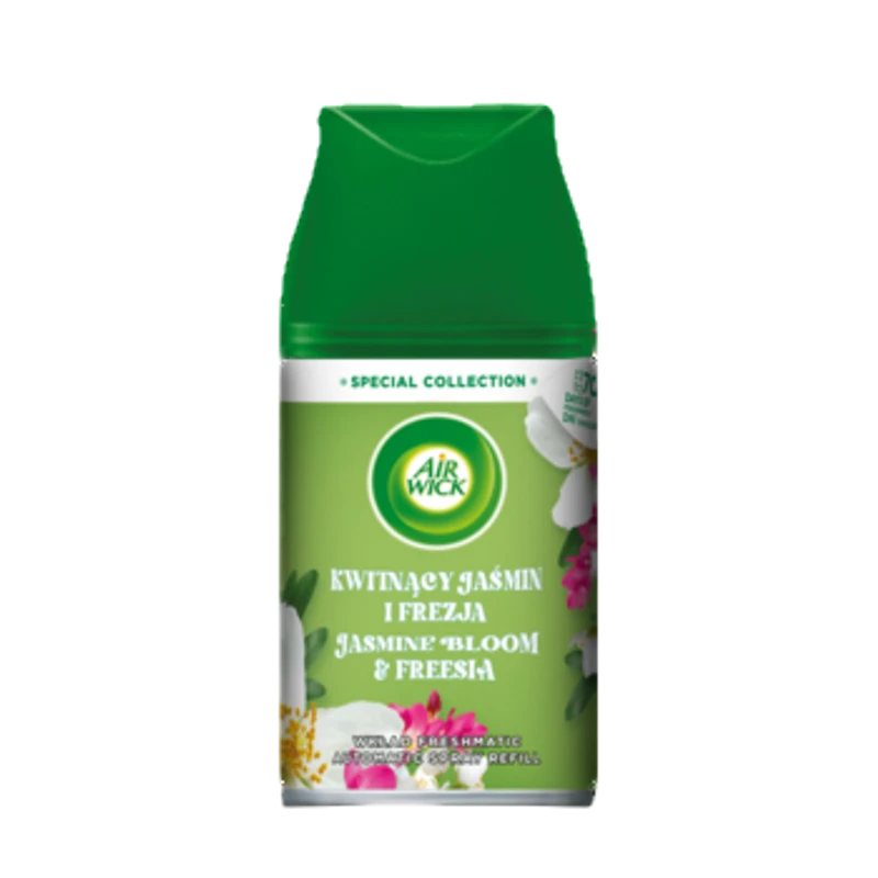 Przenieś się do spokojnego ogrodu i daj się otulić aromatowi świeżych, kwitnących kwiatów jaśminu oraz frezji. Air Wick zaprasza Cię do niezwykłą wyprawę do świata zapachu. W perfumiarskim kodzie nuty jaśminu dodają romantyzmu i wdzięku, a ich delikatny aromat pobudza zmysły i otwiera serce na nowe doznania. Frezja natomiast niesie ze sobą powiew rześkości i lekkości, jej zapach kojarzy się z przechadzką wzdłuż ukwieconych rabat w słoneczny dzień. Gdy takie aromaty goszczą w Twoim domu, nic nie zakłóci poczucia zadowolenia i błogości.; Niebezpieczeństwo. Skrajnie łatwopalny aerozol. Pojemnik pod ciśnieniem: Ogrzanie grozi wybuchem. Chronić przed dziećmi. W razie konieczności zasięgnięcia porady lekarza, należy pokazać pojemnik lub etykietę. Przechowywać z dala od źródeł ciepła, gorących powierzchni, źródeł iskrzenia, otwartego ognia i innych źródeł zapłonu. Nie palić. Nie rozpylać nad otwartym ogniem lub innym źródłem zapłonu. Nie przekłuwać ani nie spalać, nawet po zużyciu. W PRZYPADKU DOSTANIA SIĘ DO OCZU: Ostrożnie płukać wodą przez kilka minut. Wyjąć soczewki kontaktowe, jeżeli są i można je łatwo usunąć. Nadal płukać. Chronić przed światłem słonecznym. Nie wystawiać na działanie temperatury przekraczającej 50 °C. Zawiera Linalool i Isoeugenol. Może powodować wystąpienie reakcji alergicznej. Osoby cierpiące na nadwrażliwość zapachową powinny zachować ostrożność przy stosowaniu tego produktu. Odświeżacze powietrza nie mogą zwolnić z przestrzegania zasad postępowania w zakresie higieny. UFI:4FK4-M0QX-F00N-70C8