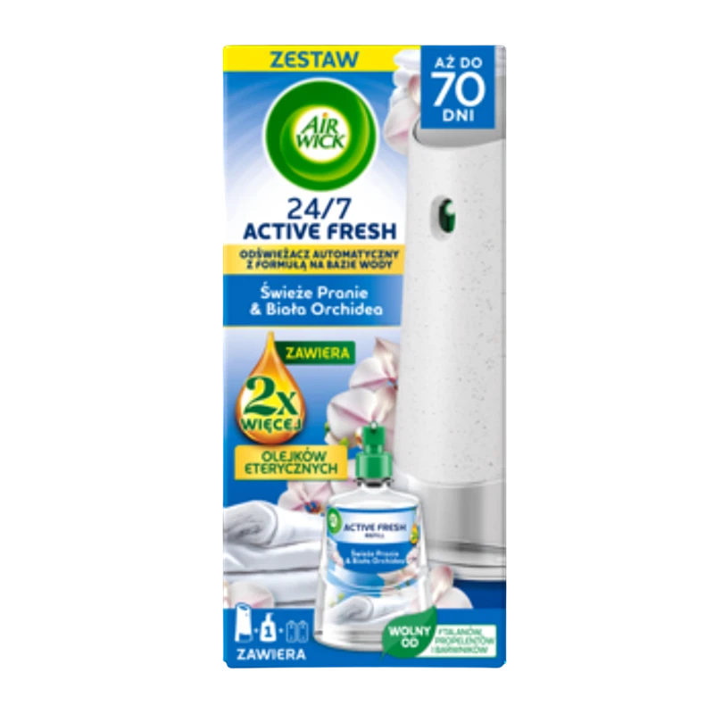 Air Wick Active Fresh Świeże pranie & Biała orchidea Komplet 228 ml z podwojoną zawartością olejków eterycznych*; Wyobraź sobie czysty zapach świeżo wypranej pościeli z nutami białej orchidei i kwiatu pomarańczy z dodatkiem cytrusów, które wniosą do twojego domu zachwycającą świeżość.; CECHY PRODUKTU: -Odświeża powietrze i neutralizuje nieprzyjemne zapachy 24/7; -Formuła na bazie wody; -Z naturalnymi olejkami eterycznymi; -95% składników pochodzenia naturalnego; -Bez propelentów, ftalanów i barwników; -Regulacja intensywności zapachu z urządzenia; -Przycisk Instant Boost - zapach na życzenie; -Działanie do 70 dni**; -Opakowanie nadające się do recyklingu; *Zapach wzbogacony 2 razy większą ilością olejków eterycznych w porównaniu do poprzedniej formuły Air Wick.; NUTY ZAPACHOWE: