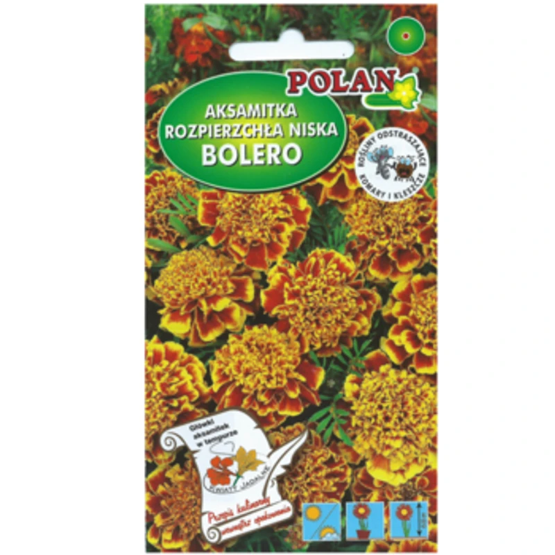 Nasiona marki PlantiCo. Aksamitka rozpierzchła Bolero, roślina jednoroczna, niska-karłowa, o kulistym pokroju, kwitnie do przymrozków, kwiatostany w odcieniu miodowo – mahoniowym. Łatwa w uprawie, rośnie na każdej glebie, siew wprost do gruntu lub z rozsady. Wytrzymała na susze i upały. Dobrze znosi przesadzanie z bryłą ziemi. Zwalcza nicienie glebowe, odstrasza mrówki, mszyce, krety ze względu na swój specyficzny zapach.