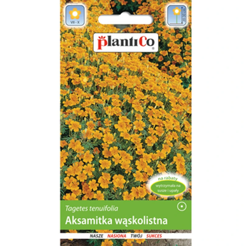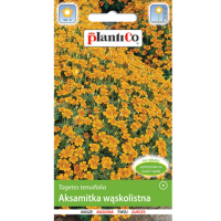 Nasiona marki PlantiCo. Aksamitka wąskolistna żółta, roślina jednoroczna, karłowa, kwitnie do przymrozków, kwiatostany drobne, pojedyncze. Pokrój rośliny kulisty, zwarty. Łatwa w uprawie, rośnie na każdej glebie, siew wprost do gruntu lub z rozsady. Wytrzymała na susze i upały. Dobrze znosi przesadzanie z bryłą ziemi. Zastosowanie: na obwódki, rabaty, do pojemników. Jest wrogiem nicieni, wabi je a przyczepione do jej korzeni giną z głodu. Odstrasza mrówki, mszyce, krety ze względu na swój specyficzny zapach.