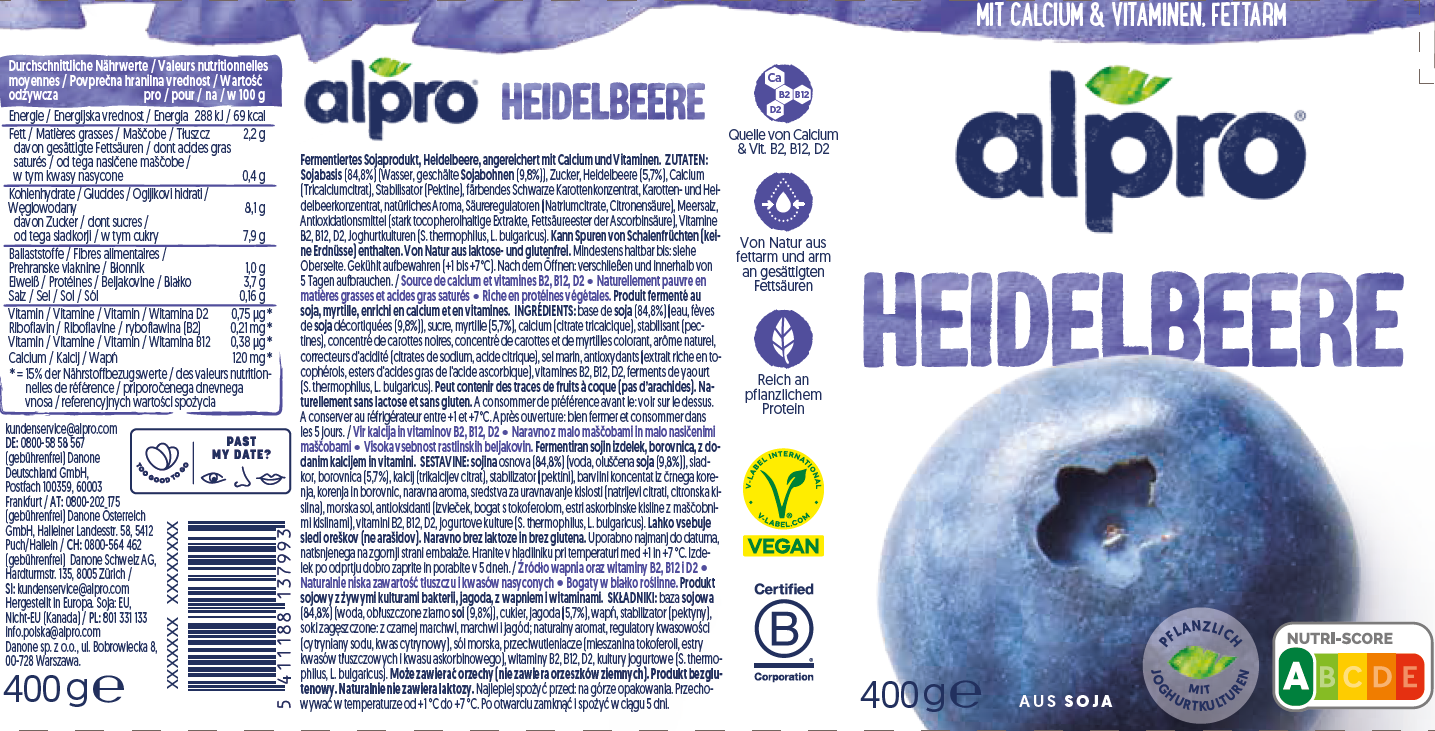 | Składniki | Baza sojowa 84,8% (woda, obłuszczone ziarno soi (9,8%)), cukier, jagoda (5,7%), wapń, stabilizator (pektyny), soki zagęszczone z czarnej marchwi, marchwi i jagód; aromat, regulatory kwasowości (cytryniany sodu, kwas cytrynowy), sól morska, przeciwutleniacze (mieszanina tokoferoli, estry kwasów tłuszczowych i kwasu askorbinowego), witaminy: b2, b12, d2; kultury jogurtowe (s. thermophilus, l. bulgaricus). może zawierać orzechy (nie zawiera orzeszków ziemnych). |