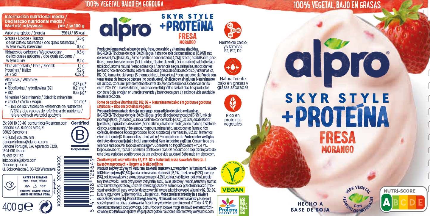 | Składniki | Baza sojowa (woda, obłuszczone ziarno soi (13,9%)), truskawka (9%), (owoce (5%) sok truskawkowy z soku zagęszczonego (4%)), cukier, stabilizator (pektyny) regulatory kwasowości (kwas cytrynowy, cytryniany sodu, kwas jabłkowy) wapń, aromat, ekstrakt z buraka, ekstrakt z marchwi, sól morska, przeciwutleniacze (mieszanina tokoferoli, estry kwasów tłuszczowych i kwasu askorbinowego), witaminy (b2, b12, d2) kultury jogurtowe (s. thermophilus, l. bulgaricus). może zawierać orzechy (nie zawiera orzeszków ziemnych). |