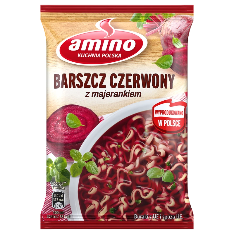 Barszcz czerwony nie tylko na Wigilię! Już dziś spróbuj nowego, udoskonalonego Barszczu czerwonego z dodatkiem aromatycznego majeranku od Amino. Uczta dla zmysłów! smak zupy podkreśla dodatek majeranku oraz czosnek, a sok z czerwonych buraków gwarantuje jej intensywną barwę. Ponadto nie zawiera konserwantów ani sztucznych barwników. Zupę zrobisz błyskawiczne - wystarczy Ci jedynie 5 minut! Doskonała do przygotowania zarówno w domu, jak i w czasie przerwy w pracy. To będzie smaczny dzień!