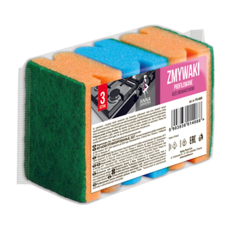 Zmywaki Anna Zaradna to niezbędne wyposażenie każdej kuchni. Dzięki nim łatwo i dokładnie umyjesz naczynia, a także blat kuchenny, zlew czy blat stołu. Zmywaki Anna Zaradna są wykonane z dwóch warstw: chłonnej pianki, za pomocą której idealnie umyjesz naczynia, oraz trwałej fibry, która pozwoli dokładnie wyszorować trudne zabrudzenia, bez rysowania powierzchni. Zmywaki Anna Zaradna dzięki swojej porowatej strukturze doskonale spieniają płyny, żele i inne detergenty, ułatwiając tym samym mycie naczyń. Zmywaki Anna Zaradna posiadają wyprofilowany kształt, który ochroni Twoje paznokcie oraz ułatwi utrzymanie gąbki podczas mycia. Tolerancja parametrów produktu +/- 10%.