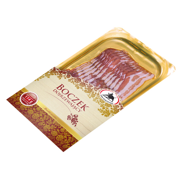 Boczek wieprzowy dojrzewający, wędzony, suszony. Produkt plasterkowany i ułożony na tackach po 100 g, zamknięty próżniowo.