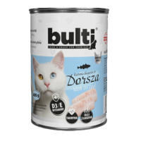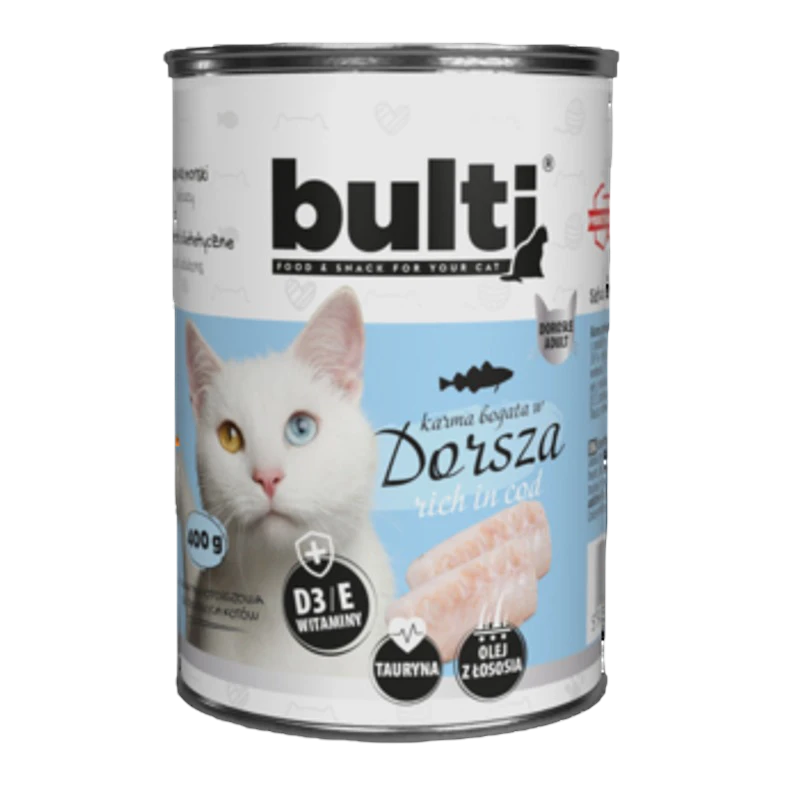 Karma mokra bulti bogata w dorsza to pełnoporcjowe pożywienie dla kotów dorosłych wszystkich ras. Charakteryzuje się gładką, kremową konsytencją oraz brakiem sztucznych barwników czy konserwantów. Mięso dorsza, a także olej z łososia zapewniają wsparcie dla zdrowej skóry, zmniejszając wypadanie sierści. Dodatek tauryny działa korzystnie na narząd wzroku oraz układ krwionośny czworonoga.