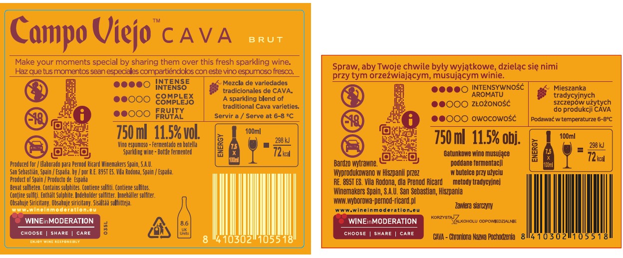 Campo Viejo Cava to eleganckie hiszpańskie wino musujące z regionu Rioja, dostępne w butelce o pojemności 0,75 litra. Charakteryzuje się jasnozłotym kolorem i delikatnymi bąbelkami. Aromat łączy nuty białych kwiatów, zielonych jabłek i cytrusów z subtelnym akcentem tostów. Smak jest świeży i zbalansowany, z przyjemną kwasowością i długim finiszem. Idealne jako aperitif oraz do owoców morza, lekkich sałatek i drobiu. Doskonałe na każdą okazję, od romantycznych kolacji po świętowania z przyjaciółmi.