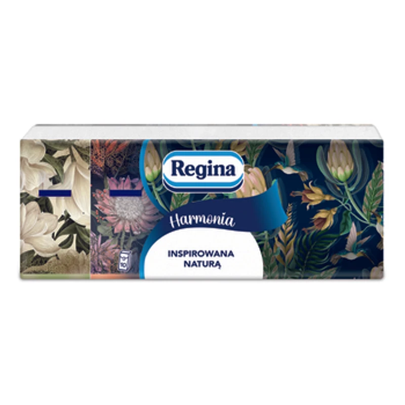 Regina Harmonia to miękkie, 3-warstwowe chusteczki w nowoczesnych opakowaniach inspirowanych naturą. Wyjątkowa grafika oraz starannie dobrane kolory z łatwością przypadną do gustu konsumentom, doskonale dopasują się do każdego wnętrza i na stałe zagoszczą w torebkach jako wersja kieszonkowa. Te bogato zdobione opakowania w czterech różnych wzorach pozwolą dobrać odpowiedni wariant dla każdego.