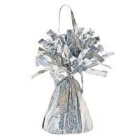 Ciężarek do balonów w kształcie stożka, srebrny. Obciążnik znajduje się w dekoracyjnej folii o holograficznym połysku. Srebrny obciążnik do balonów to idealny wybór przy tworzeniu dekoracji balonowych na ślub, wesele, urodziny i wiele innych okazji. Ciężarek do balonów jest przede wszystkim przeznaczony do balonów na hel, ale jego zastosowanie może być dużo większe.