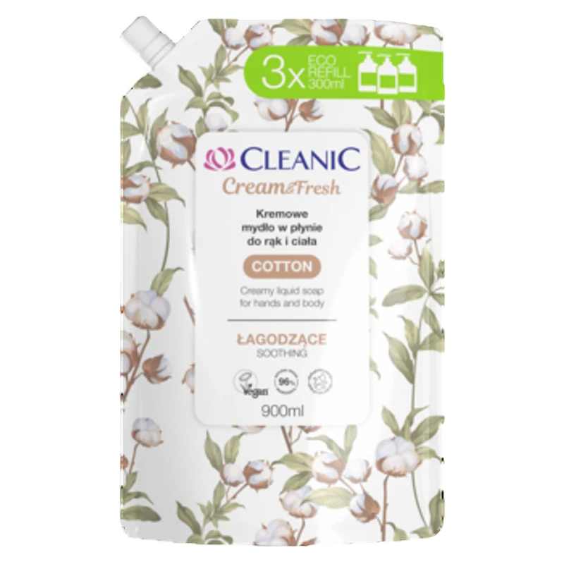 | Krótki opis marketingowy | Cleanic cream & fresh cotton, łagodzące kremowe mydło w płynie do rąk i ciała, 900 ml (3x refill) cleanic cream & fresh cotton dla osób szukających delikatnej, łagodzącej pielęgnacji opartej na naturalnych składnikach. idealne do skóry wrażliwej, dla dzieci i całej rodziny. cleanic cream & fresh cotton to wyjątkowo łagodne, kremowe mydło w płynie stworzone z myślą o codziennej pielęgnacji dłoni i ciała. wzbogacone o ekstrakt z bawełny, znany z właściwości kojących i ochronnych, skutecznie oczyszcza skórę, nie naruszając jej naturalnej bariery hydrolipidowej. bogata formuła, aż 96% składników pochodzenia naturalnego, pielęgnuje skórę i pozostawia ją miękką, gładką i odświeżoną. mydło ma przyjemny, delikatny zapach i jest odpowiednie nawet dla bardzo wrażliwej skóry. cleanic cream & fresh cotton: • łagodna, kremowa formuła – idealna do codziennego stosowania, nie wysusza, pielęgnuje skórę dłoni i ciała, • ekstrakt z bawełny – działa kojąco, zmniejsza podrażnienia, • 96% składników pochodzenia naturalnego, • wydajne opakowanie 900 ml – 3x refill, • hipoalergiczne i testowane dermatologicznie, • przyjazne środowisku – mniej plastiku, wegańska formuła. |