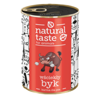 Natural Taste w nowej odsłonie to przede wszystkim prosty skład oparty na wysokiej zawartości mięsa i produktów pochodzenia zwierzęcego z wołowiny i wieprzowiny. Dobór surowców bogatych w różnego rodzaju tkanki: mięśniową, łączną, serca mięśniowego to źródło niezbędnych dla psa składników odżywczych. Zróżnicowanie wielkości kawałków stymuluje prawidłową pracę układu trawiennego. Danie zostało precyzyjnie skomponowane pod kątem zawartości wszystkich składników mineralnych, ze szczególnym zwróceniem uwagi na odpowiedni stosunek ilości wapnia do fosforu, gwarantujący prawidłowe współdziałanie układów kostnego i mięśniowego.