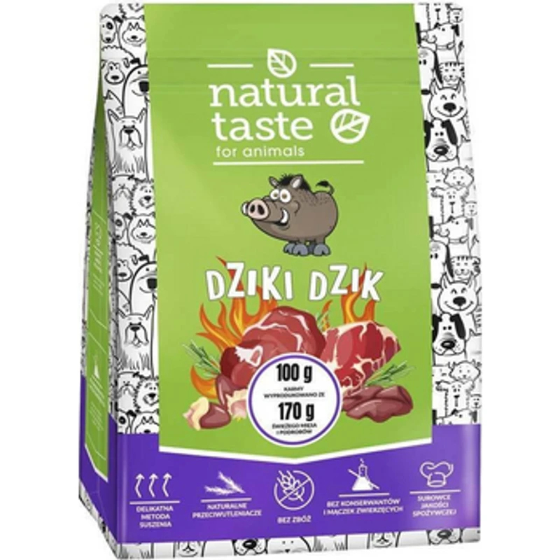 Natural Taste – Dziki dzik to pełnoporcjowa karma przeznaczona dla dorosłych psów wszystkich ras, pokrywająca w 100% ich dzienne zapotrzebowanie na wszystkie składniki odżywcze. Urozmaicony i wartościowy skład obejmujący 80% mięsa i produktów pochodzenia zwierzęcego z dziczyzny, wieprzowiny, wołowiny i kurczaka jest źródłem białka o bardzo wysokiej strawności i jakości biologicznej bogatej we wszystkie niezbędne aminokwasy. Dobór surowców bogatych w różnego rodzaju tkanki: mięśniową, łączną, serca oraz różne rodzaje narządów zapewnia zarówno różnorodność składników odżywczych, jak i tekstur, które w najefektywniejszy sposób stymulują procesy trawienne.