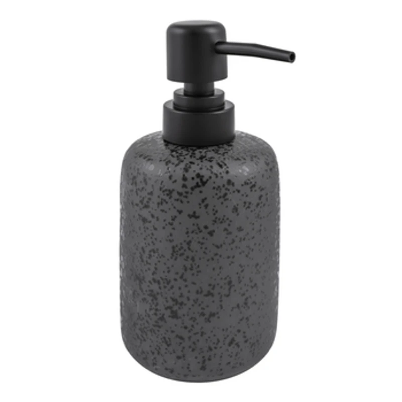 Materiał: kamionka. Dozownik mydła w płynie z serii Hades o pojemności 350 ml. Wykonany został z kamionki w kolorze ciemnego, matowego antracytu. Posiada nieregularne, nakrapiane plamki w kolorze czarnym, które nadają mu niezwykłego charakteru. Funkcjonalna pompka dozująca wykonana została w kolorze czarnego matu.