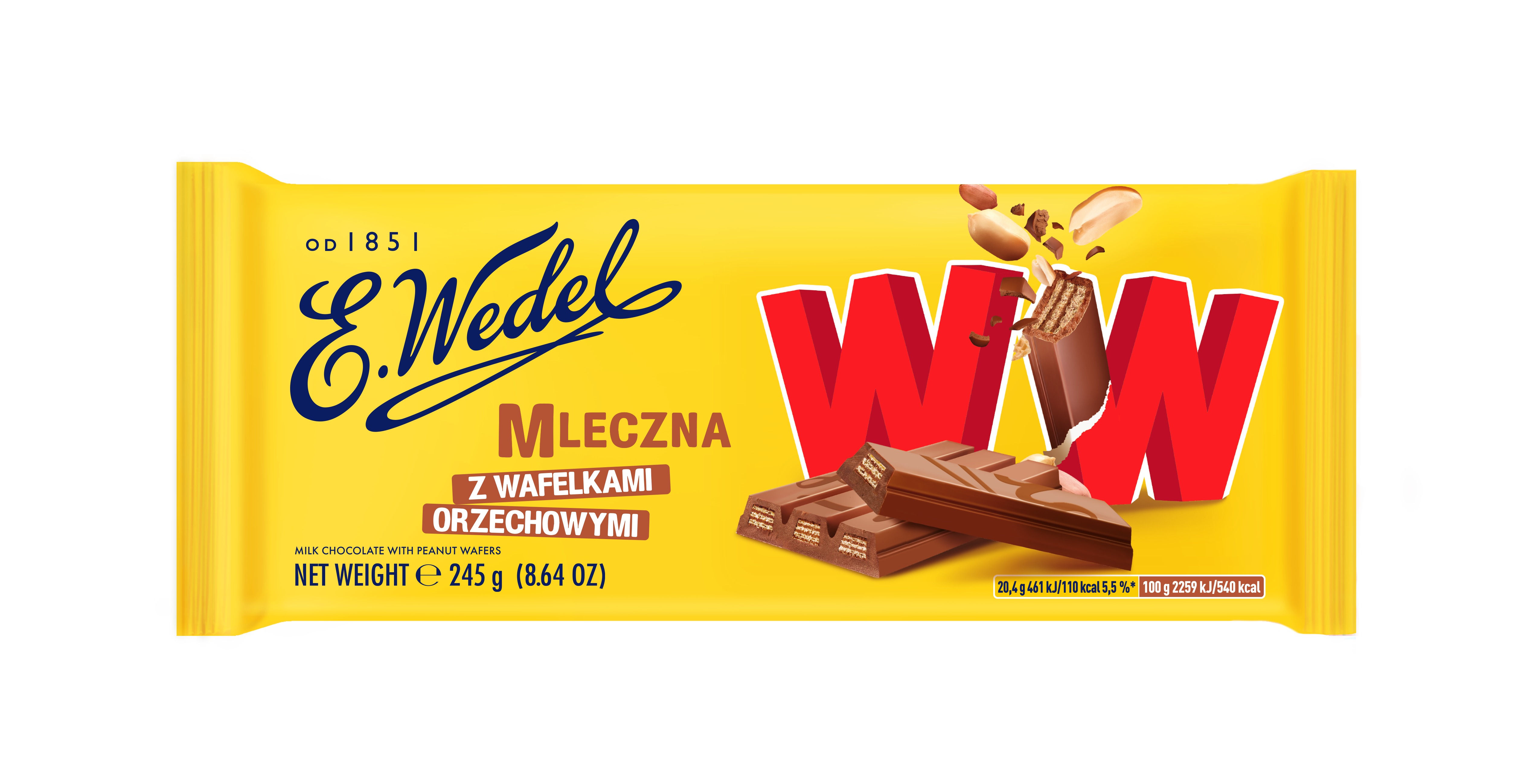 Kultowe WW w formie tabliczki czekolady to chrupiące i pyszne wafelki przekładane nadzieniem orzechowym, oblane mleczną wedlowską czekoladą. Idealny towarzysz małych, codziennych przyjemności, którymi dzięki wyjątkowej formie, możesz w łatwy sposób podzielić się z bliskimi.