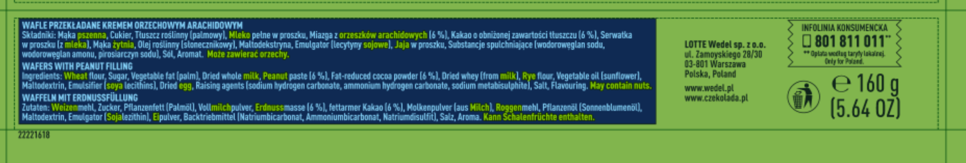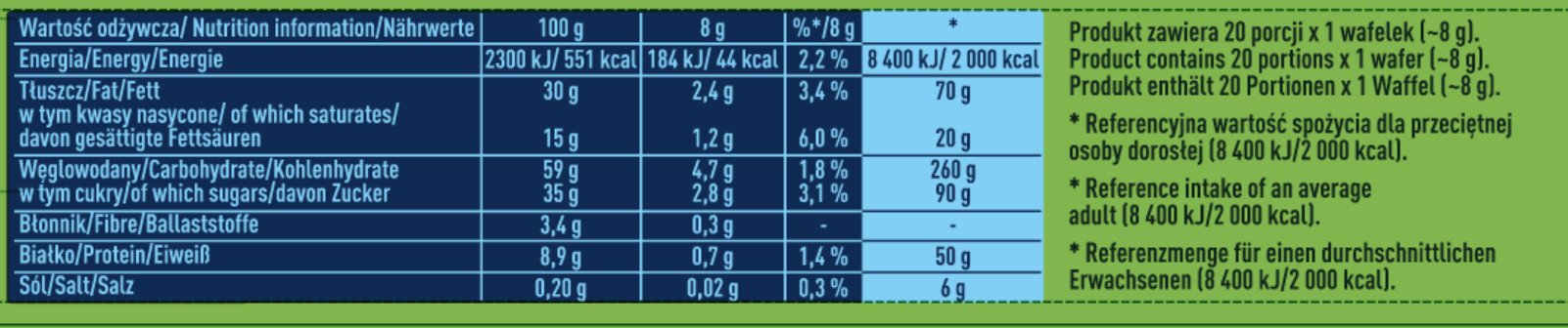 | Składniki | Mąka pszenna, Cukier, Tłuszcz roślinny (palmowy), Mleko pełne w proszku, Miazga z orzeszków arachidowych (6%), Kakao o obniżonej zawartości tłuszczu (6%), Serwatka w proszku (z mleka), Mąka żytnia, Olej roślinny (słonecznikowy), Maltodekstryna, Emulgator (lecytyna sojowa), Jaja w proszku, Substancje spulchniające (wodorowęglan sodu, wodorowęglan amonu, pirosiarczyn sodu), Sól, Aromat. Może zawierać orzechy. |