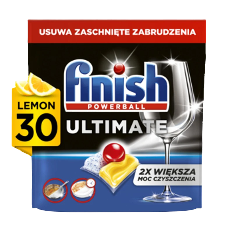 Kapsułki zapewniają również skuteczną ochronę filtrów zmywarki oraz szkła i zapobiegają osadzaniu się kamienia. Finish Ultimate działają w niskich temperaturach. Płynny Powerball zapewnia blask.