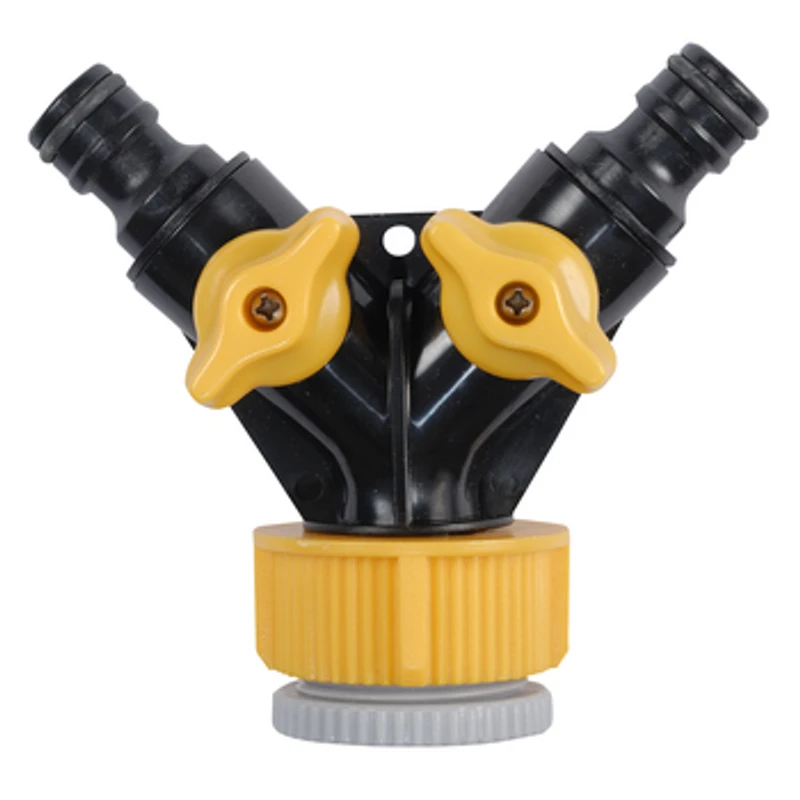 Do podłączenia jednego lub dwóch węży ogrodowych zakończonych szybkozłączkami do kranu z gwintem zewnętrznym 1" lub 3/4". Wyposażony w dwa niezależne zawory regulujące przepływ wody.
