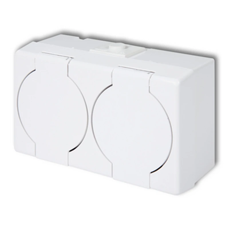 Gniazdo hermetyczne podwójne 2X2P+Z IP44 klapka biała GHS-2n do montażu natynkowego. Dedykowane do montażu w miejscach narażonych na wodę, takich jak: kuchnie, łazienki, piwnice.