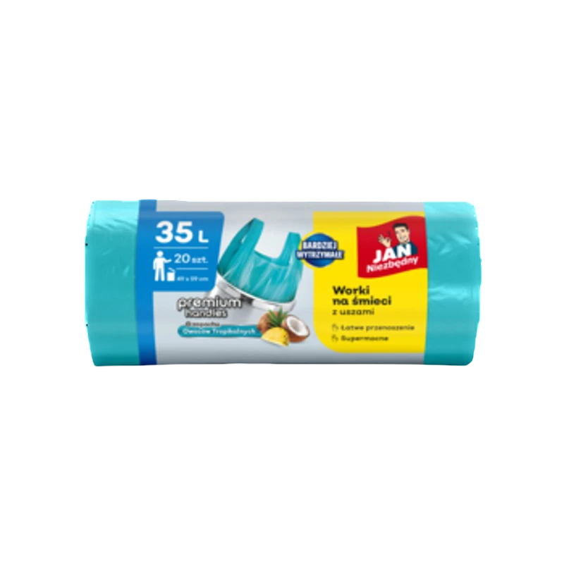 | Krótki opis marketingowy | Jan niezbędny worki hd t-shirt o zapachu owoców tropikalnych 35l wyróżniają specjalne uchwyty typu t-shirt, które ułatwiają przenoszenie oraz zawiązywanie worka bez ryzyka, że coś się wysypie lub wyleje podczas wynoszenia śmieci. |