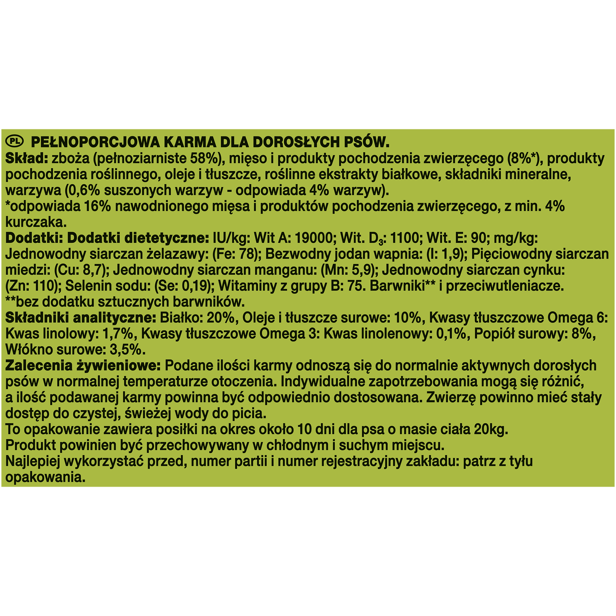 | Skład | Zboża (pełnoziarniste 58%) mięso i produkty pochodzenia zwierzęcego (8%)* produkty pochodzenia roślinnego oleje i tłuszcze roślinne ekstrakty białkowe składniki mineralne warzywa (0,6% suszonych warzyw - odpowiada 4% warzyw) *odpowiada 16% nawodnionego mięsa i produktów pochodzenia zwierzęcego, z min. 4% kurczaka |