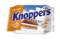 Wafelek mleczno- orzeszki ziemne. Wafelek nadziewany, warstwa wafla z polewą kakaową.