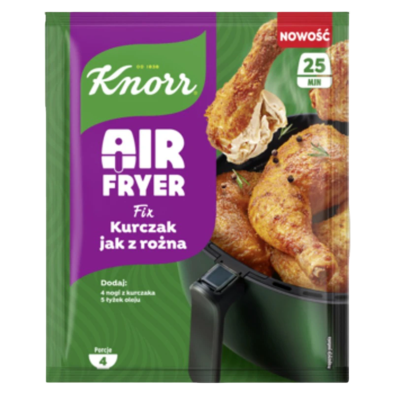 | Instrukcje dotyczące przygotowania | Do przygotowania potrzebujesz: 4 nogi z kurczaka, 5 łyżek oleju. 1. rozgrzej frytkownicę beztłuszczową do 180℃ przez 5 minut. 2. w misce wymieszaj knorr fix air fryer z 5 łyżkami oleju, aż powstanie jednolita masa. następnie dokładnie pokryj nią nogi z kurczaka. 3. ułóż mięso w koszyku frytkownicy w jednej warstwie. włóż koszyk do urządzenia i smaż przez 25 minut. wskazówka: dla intensywniejszego smaku zamarynuj mięso w mieszance przez 30-45 minut przed smażeniem. jeśli pałki są większe, wydłuż czas smażenia do 30-35 minut, kontrolując stopień wypieczenia i chrupkość. |