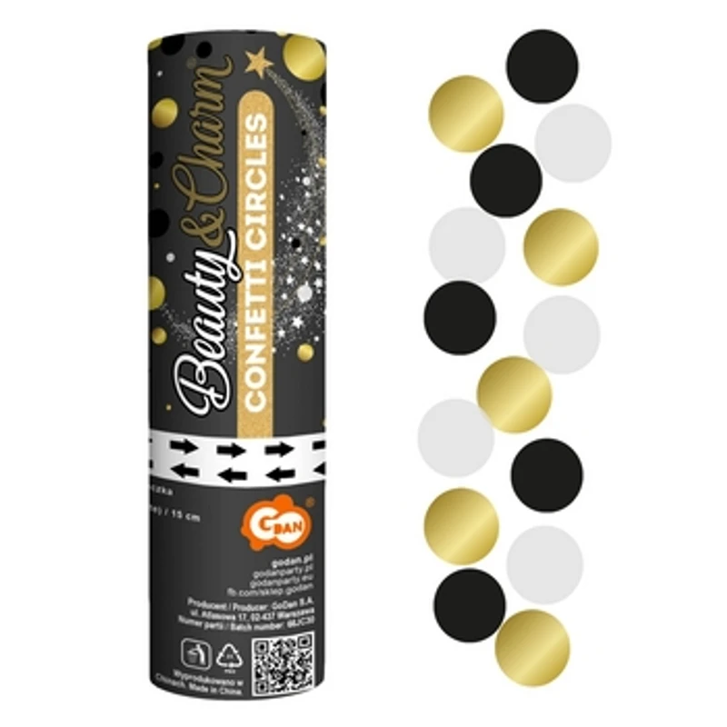 Konfetti pneumatyczne Kółeczka czarne, złote, białe, 15 cm