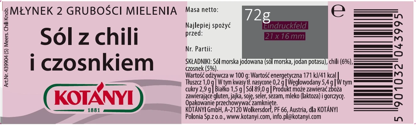 | Składniki | sól morska jodowana (sól morska, jodan potasu) chili (6%) czosnek (5%) |
