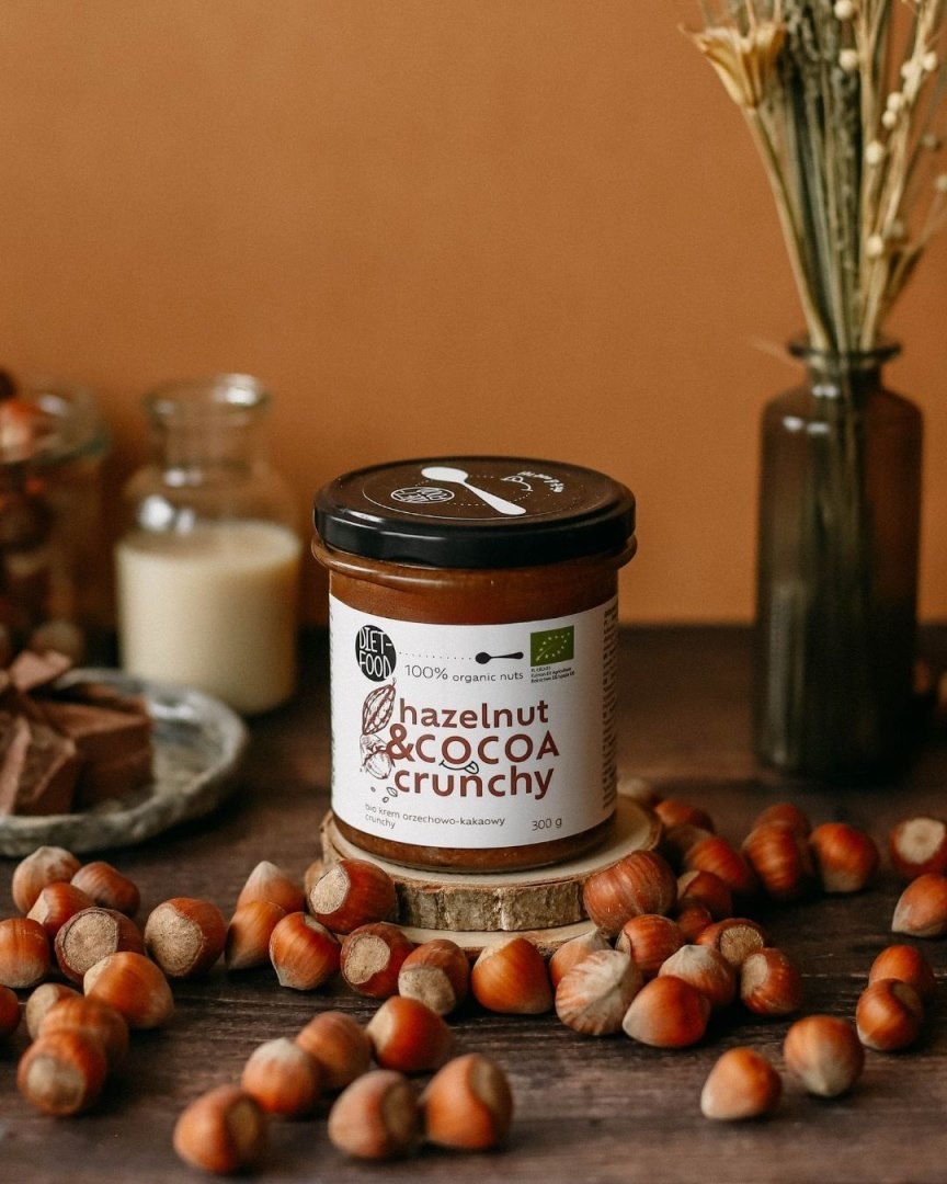 , certyfikowany ekologiczny krem z orzechów laskowych, kakao oraz cukru kokosowego, bez sztucznych dodatków.