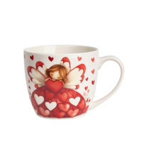 Kubek 460 ml w "koszyczku" Anioł, charakteryzuje się naturalnym kremowo-białym kolorem z delikatnym połyskiem oraz wyjątkową wytrzymałością i trwałością, zachowując lekkość i finezję. Linia zdobiona motywem uroczej dziewczynki w czerwonej balowej sukni ze skrzydłami anioła w otoczeniu różowo - czerwonych serduszek. Całość zapakowana w ozdobny blister z tym samym motywem to doskonały pomysł nie tylko na Walentynki, ale również na każdą inną okazję, w której chcesz wyrazić swoje uczucia.