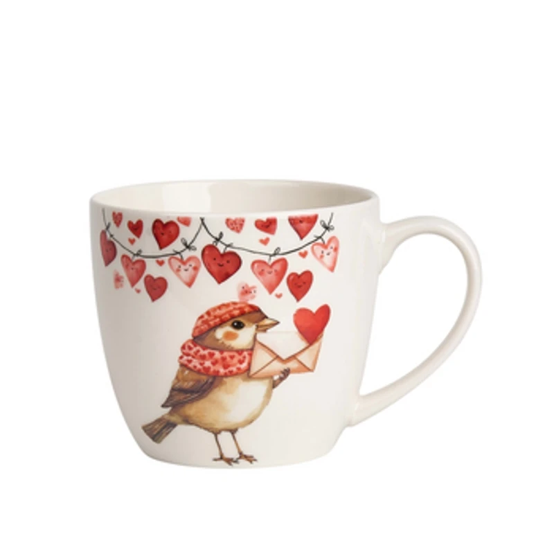 Kubek 460 ml w "koszyczku" WRÓBEL wchodzący w skład serii SERCA, charakteryzuje się naturalnym kremowo-białym kolorem z delikatnym połyskiem oraz wyjątkową wytrzymałością i trwałością, zachowując lekkość i finezję.