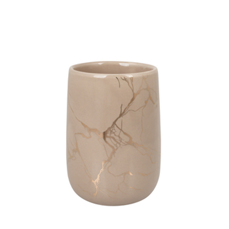 Materiał: kamionka. Marmurkowy komplet łazienkowy Diosa będzie idealnym dodatkiem zarówno do łazienek glamour, jak i w stylu boho. Całość zestawu zawiera dozownik mydła, kubek łazienkowy, mydelniczkę oraz szczotkę toaletową. Kubek łazienkowy może służyć do przechowywania szczoteczek do zębów i pasty, a także jako kubek do płukania ust. Sprawdzi się idealnie również jako pojemnik na akcesoria do makijażu czy grzebień do włosów. Wyposażenie łazienki w akcesoria łazienkowe z jednego kompletu pozwala zachować spójność i harmonię w przestrzeni.