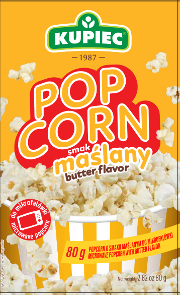 Nowość w portofolio firmy Kupiec – popcorn do mikrofali w wygodnych opakowaniach. Popcorn to popularna przekąska, po którą sięgamy najchętniej podczas oglądania filmów czy na imprezach ze znajomymi. Stanowi świetną alternatywę do chipsów. Popcorn o smaku masła dodatkowo posolony przypomni smak znanego i lubianego słonego masła. Ponadto produkt charakteryzuje się wysoką zawartością błonnika pokarmowego.