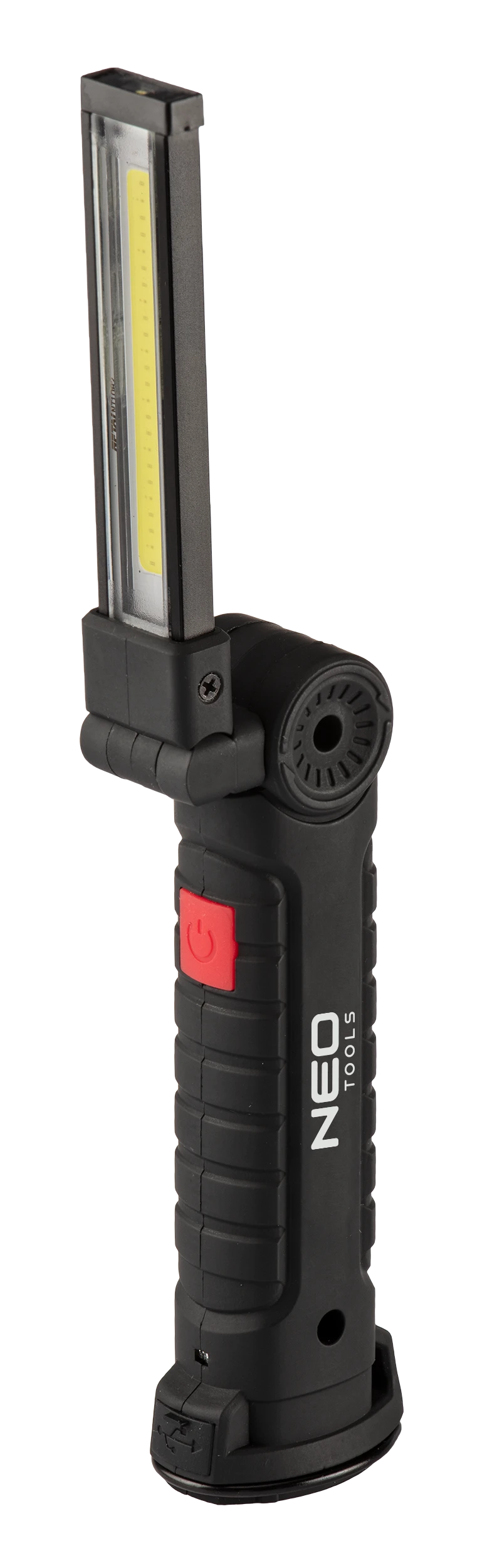 Lampa warsztatowa akumulatorowa Neo lampa, latarka, moc 3W, 200 lumenów, LED COB, akumulator 1200mAh 3.7 Li-ion (w zestawie), ładowarka USB 5V/1A (w zestawie), magnes w podstawie, składana konstrukcja, czas ładowania 4h, czas pracy max 3h, 5 funkcji świecenia latarka, 100% lampa, 50% lampa, lampa kolor czerwony, lampa kolor czerwony strobe